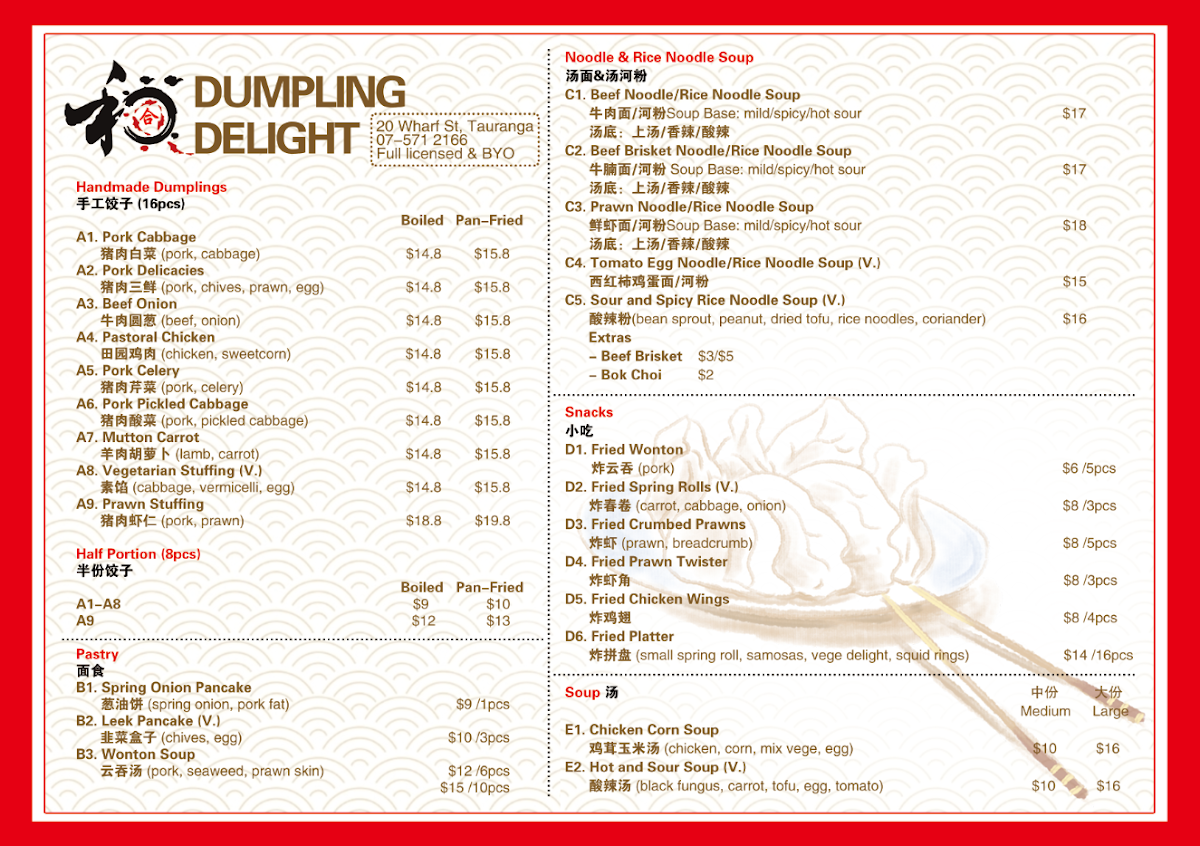 If you're in Tauranga and craving delicious, freshly made dumplings, you're in for a treat at Dumpling Delight. Located at 20 Wharf Street, this spot offers a menu that celebrates the heart and soul of dumpling cuisine. Whether you're in the mood for classic pork and chive or something a little more adventurous, there's a filling for every taste. Each dumpling is carefully crafted with the finest ingredients, offering that perfect balance of crispy on the outside, juicy on the inside. Pair them with a side of tangy dipping sauces, and you're in for a satisfying meal. Whether you're grabbing a quick lunch or enjoying a leisurely dinner with friends, the variety on the Dumpling Delight Menu is sure to satisfy your cravings.
